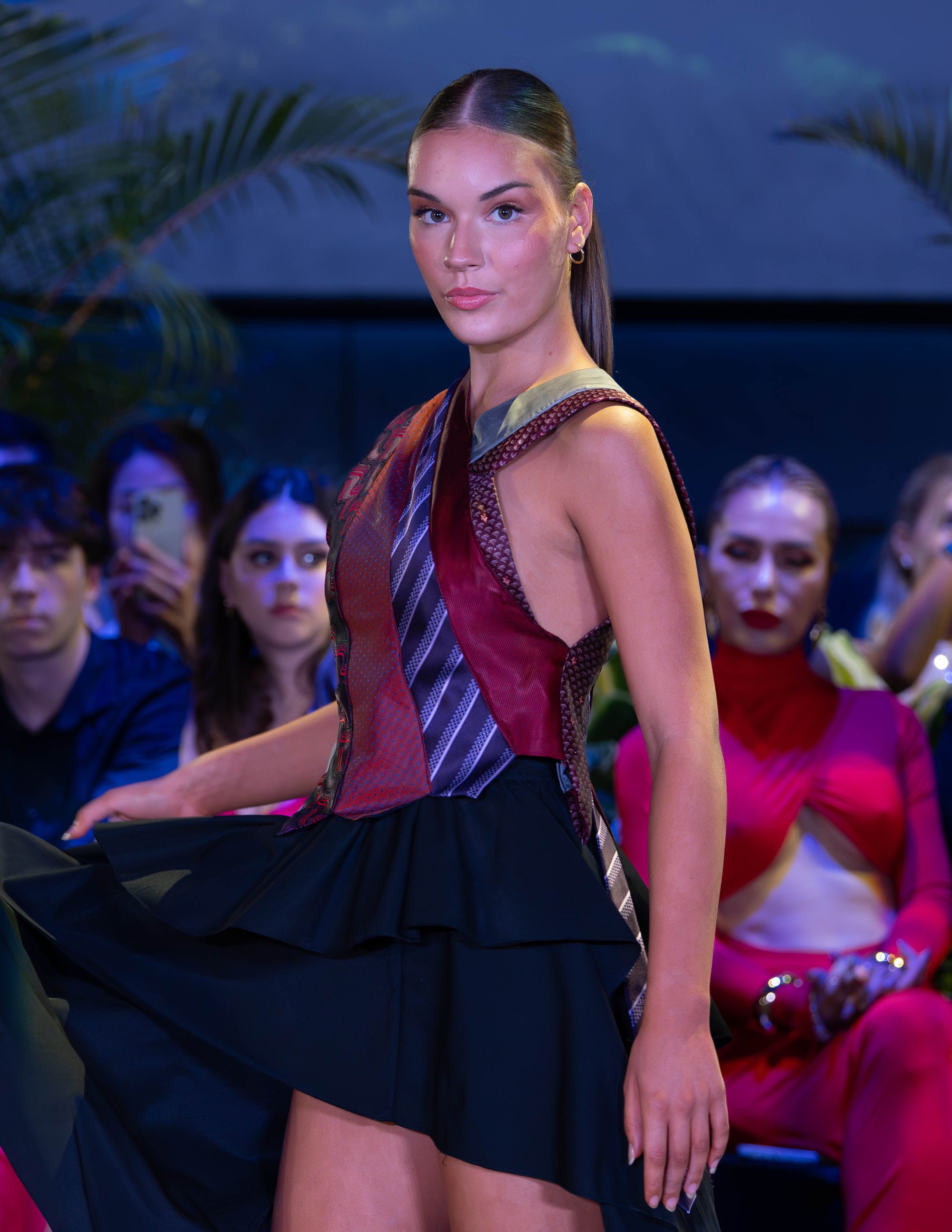 A statement piece celebrating texture and movement. This fitted vest features intricate drapery of upcycled ties, with additional hanging ties at the back for a distinctive, dynamic finish. Designed to combine structure with playful detailing, it captures both craftsmanship and creativity.